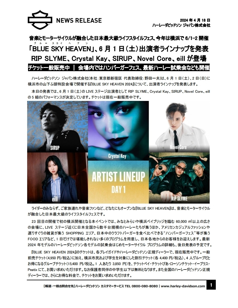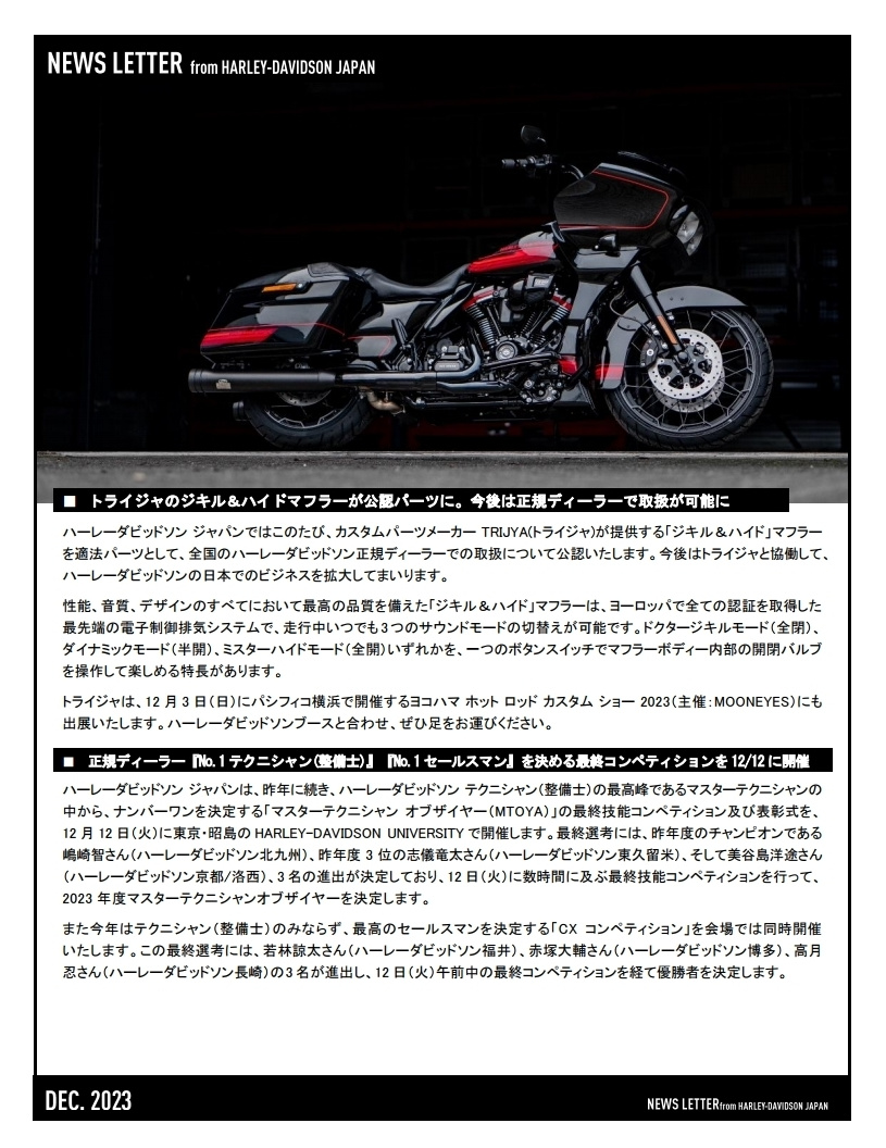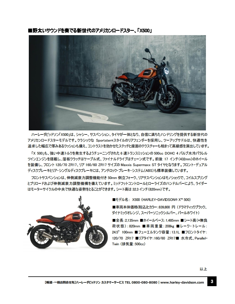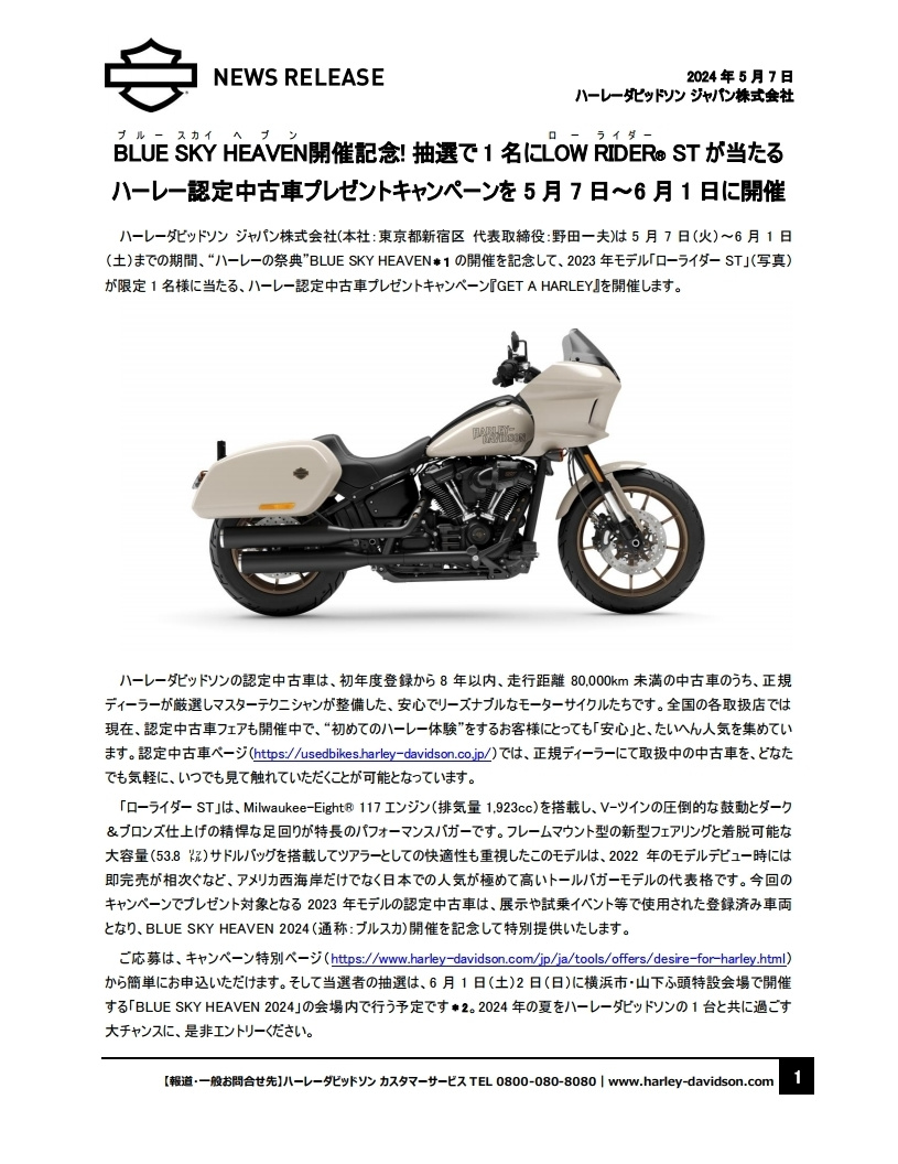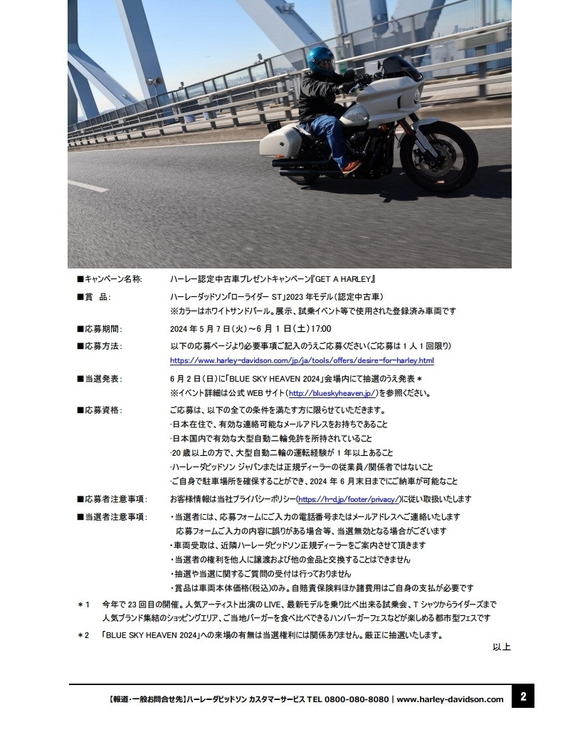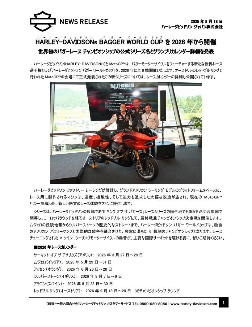 「Freedom for all, All for Freedom(全てを自由のために。自由を全ての人へ。)」を世界で掲げるHARLEY-DAVIDSON®ではこれからも、モーターサイクルと共にある暮らしを通じお客様へ“新しい自由”を提案してまいります。